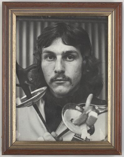 Framed black and white photograph of Australian fencing champion, Greg Benko. Born in 1952 to Hungarian parents Greg Benko began fencing at the age of 12, when he was 'discovered' by Olympic Coach Mike O'Brien in a physical education class at Bentleigh High School. He currently (2021) remains Australia's best-placed Olympic fencer, coming 6th in the individual foil in the Montreal Olympics in 1976, and is one of only two Australian men to win the open national title for all three weapons (foil, epée and sabre ) in a single year.