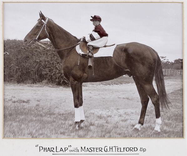 This framed hand coloured photograph depicts Gerald Telford, the son of trainer Harry Telford, riding on the back of champion racehorse Phar Lap. It belonged to the family of his trainer Harry Telford family, and was amongst a number of items donated to the museum by them in the 1990s.