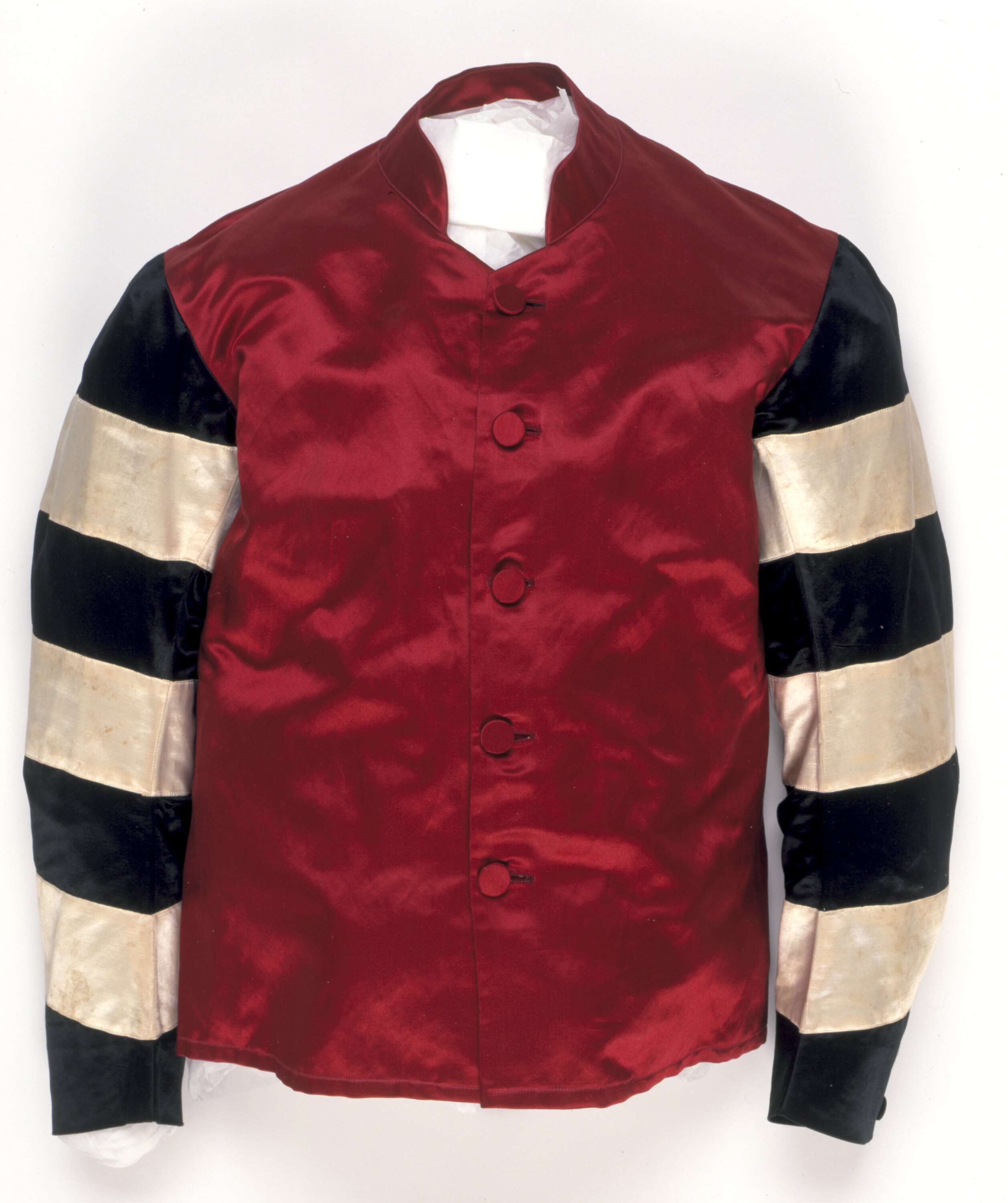 Small riding jacket constructed from red, white and black silk. There are five self cover buttons along the front of the jacket, and one on each cuff. It has a mandarin collar around the top, with a red silk handing loop sewn inside the back. There is a printed label located at the bottom of the inside of the right front panel. The jacket appeared to be machine stitched.