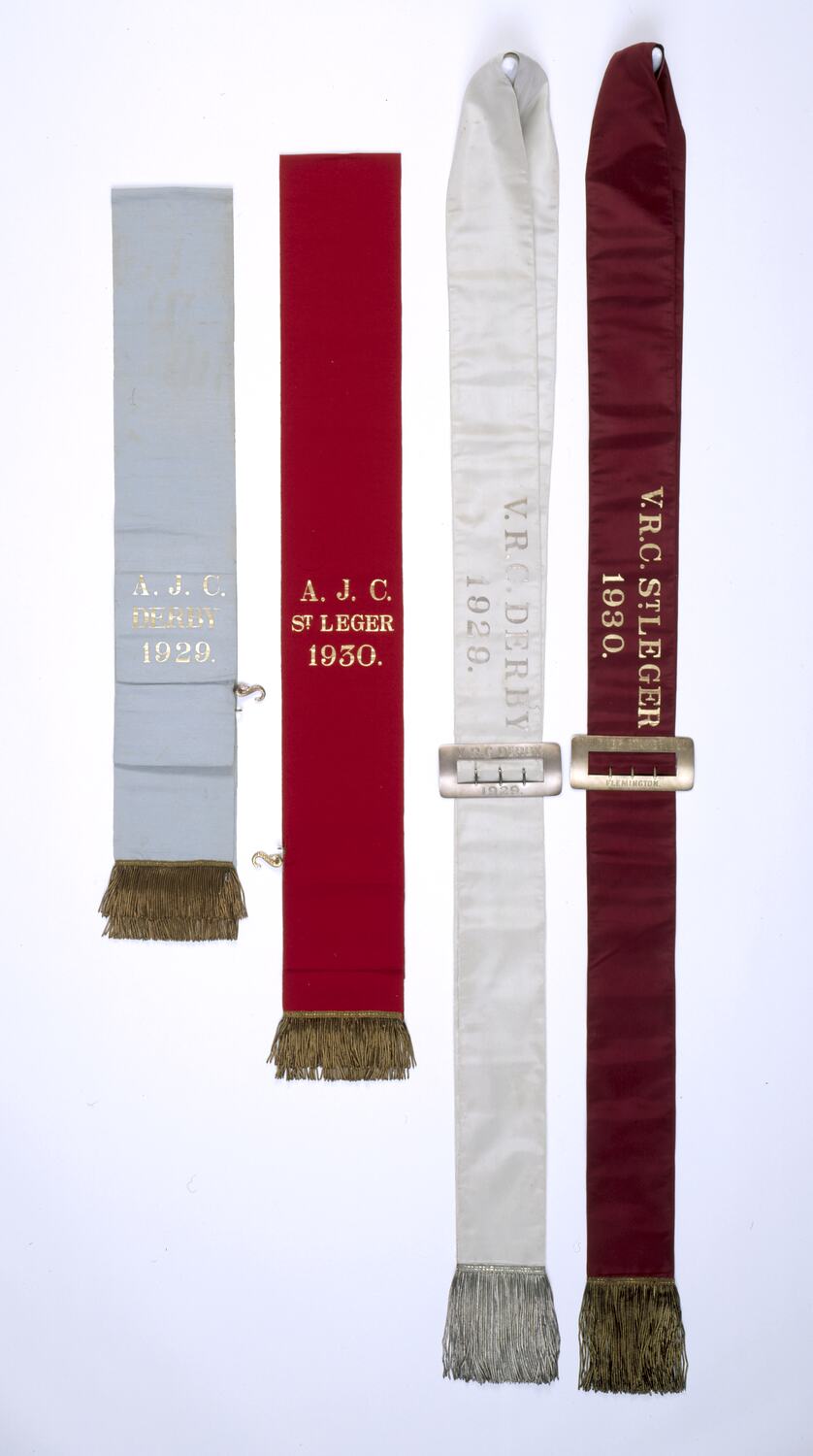 Sash presented to champion race horse Phar Lap after winning the VRC Derby at Flemington Racecourse in Melbourne on the 2nd November, 1929. It was retained by family of his trainer Harry Telford family, and was amongst a number of items donated to the museum by them in the 1990s.