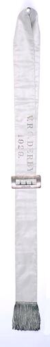 Presentation sash consisting of a long length of white woven silk, doubled over to form a loop. Along the bottom edges are long pieces of silver metal fringing. The sash is treaded through a large rectangular sterling silver buckle, held in place by three prongs. Around the front edge of the buckle are large engraved letters.