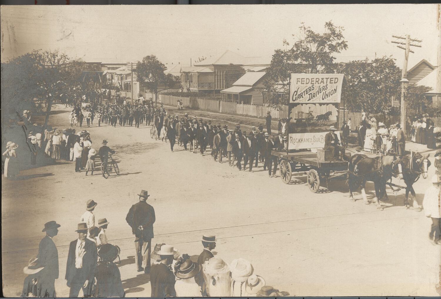 Federated Carters and Drivers Union procession float and marches in residential streetscape with foreground of spectators and onlookers. Parade consists of horse-drawn cart carrying union banner. Inscribed union banner carried on cart 'FEDERATED / CARTERS DRIVERS UNION / ROCKHAMPTN SUB B'.