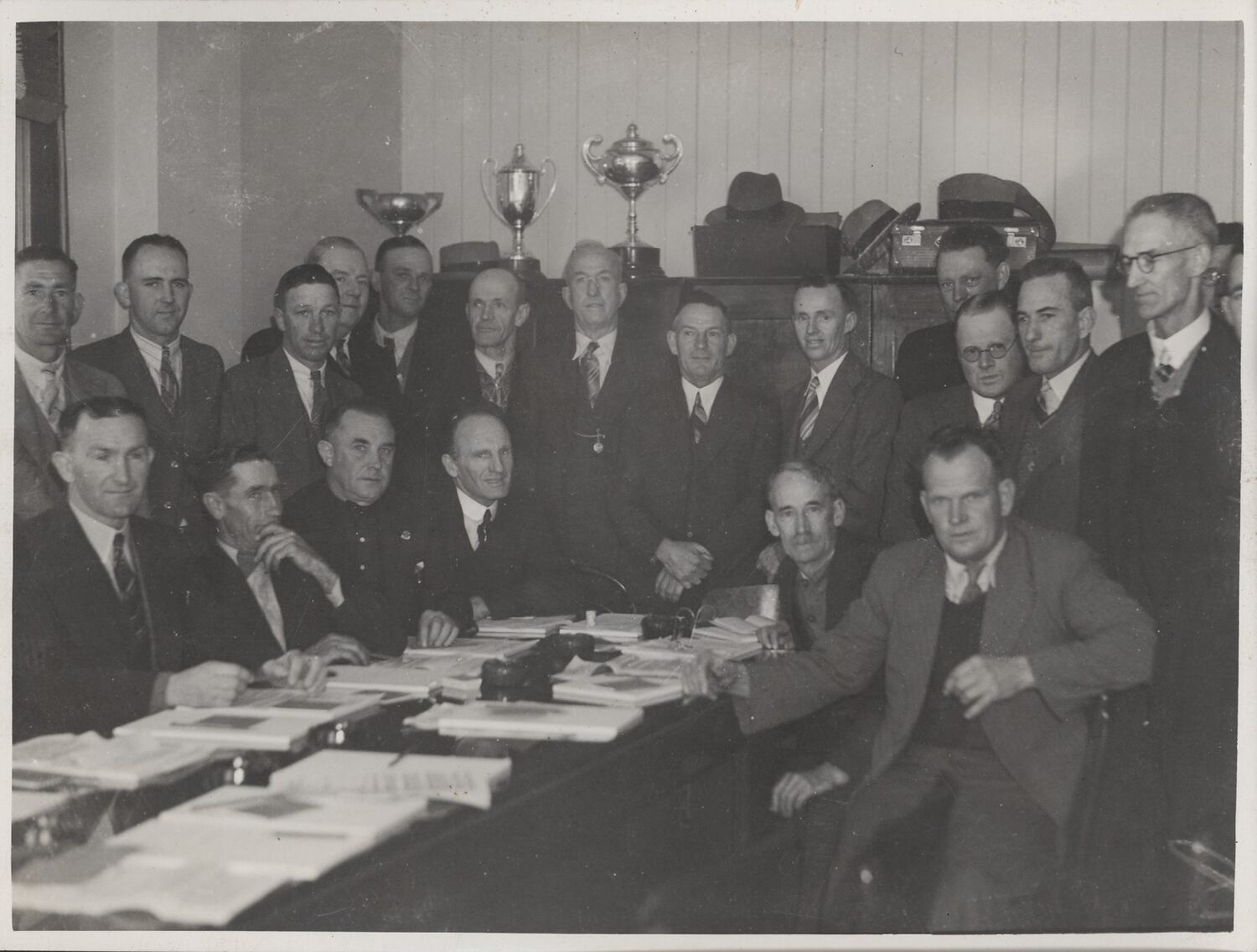 Group of nineteen Transport Workers Union Queensland branch officers in office interior with memorial cups and hats displayed on top of the cupboard in the background. Front row consists of six officers sitting at a table. Back row consists of thirteen officers standing. Most of the men are wearing suits and ties.