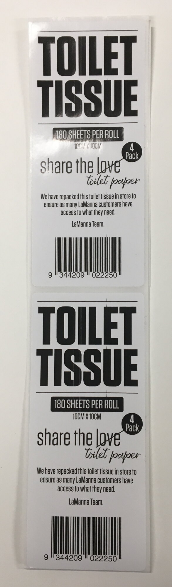 TOILET / TISSUE / 180 SHEETS PER ROLL / 10CM X 10CM / 4 / Pack / share the love ['love' crossed out] / toilet paper / We have repacked this toilet tissue in store to / ensure as many LaManna customers have / access to what they need. / LaManna Team. / [Barcode] 9 344209 022250