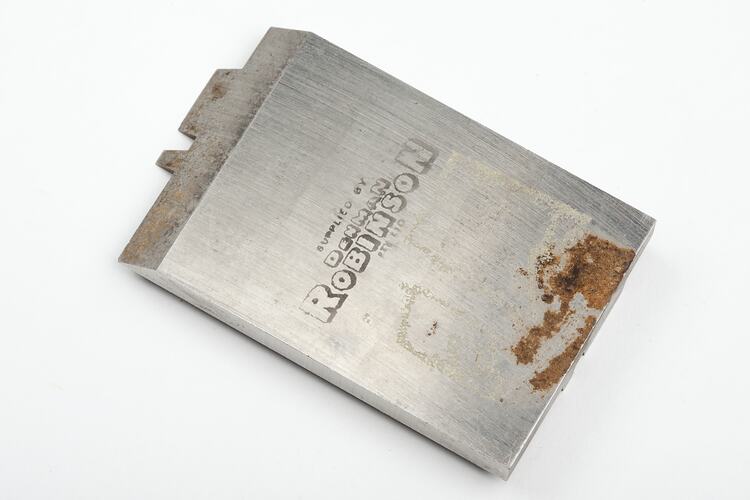 Steel cutter manufactured by Denman Robinson Pty. Ltd, circa 1970-1990. It was found in the drawer of a cabinet in Area E4 in Adolph Bruhn & Son's Wood Turners Shop, 283 Coventry Street, South Melbourne. The business was established by Adolph Bruhn circa 1893 in Little Collins Street, Melbourne. Upon his death in 1919 it was then operated by Adolph's son Sophus Christopher Bruhn. Upon Sophus's death in 1959 his son Sophus Walter Bruhn took over the business. In 1970 Sophus reduced the scale of the business and relocated to South Melbourne. The business closed upon Sophus's death in January 1990.