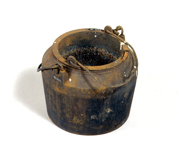 Glue pot used at Simpson's Gloves Pty Ltd, Richmond. Iron pot with second smaller pot. The larger outer pot held water which when warmed heated glue pellets in smaller, inner pot.