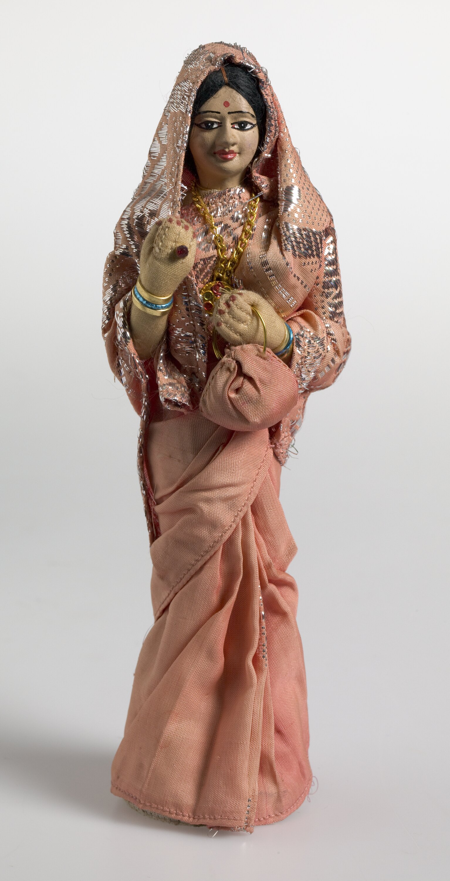 Female doll dressed in a light pink sari, with a pink and silver head covering. The doll's arms are made from light brown fabric and its face has been painted in a similar shade, with bright red lips, dark eyes and a and a red tilaka or bind on the forehead. The doll wears blue and gold bracelets on both wrists, a tick gold chain around her neck and carries a light pink handbag.