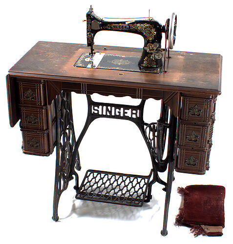 Sewing machine affixed to wooden bench with treadle beneath. Machine is enamelled in black, yellow and gold and has a metal plate inscribed with several patent dates from 1892. Label with number on top of sewing machine. Wooden bench; sewing machine cover with locking device at front; six small carved wooden drawers on either side of bench top with brass handles; wrought iron frame; worn red velvet cover on iron footplate. Accompanying the machine is a small black accessory box with several attachments inlcuding a 'vibrating shuttle', two instruction booklets with details of the Singer company, and a small pin cushion with needles.