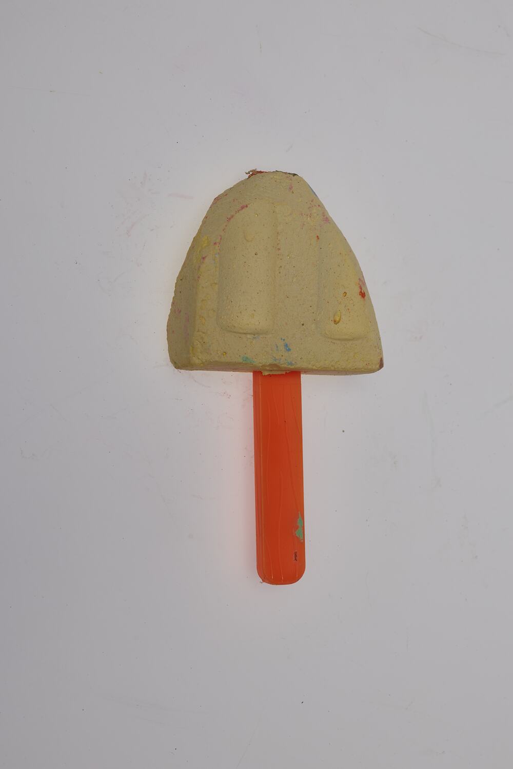Piece of used yellow chalk with an orange stick, shaped like an ice pole.