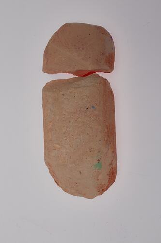 Two pieces of used orange chalk (originally one piece), one of a number of chalks and other tools used by Elizabeth and Esther Li to create drawings in their Glen Waverley driveway during the covid-19 lockdown in Melbourne, May - June 2020.