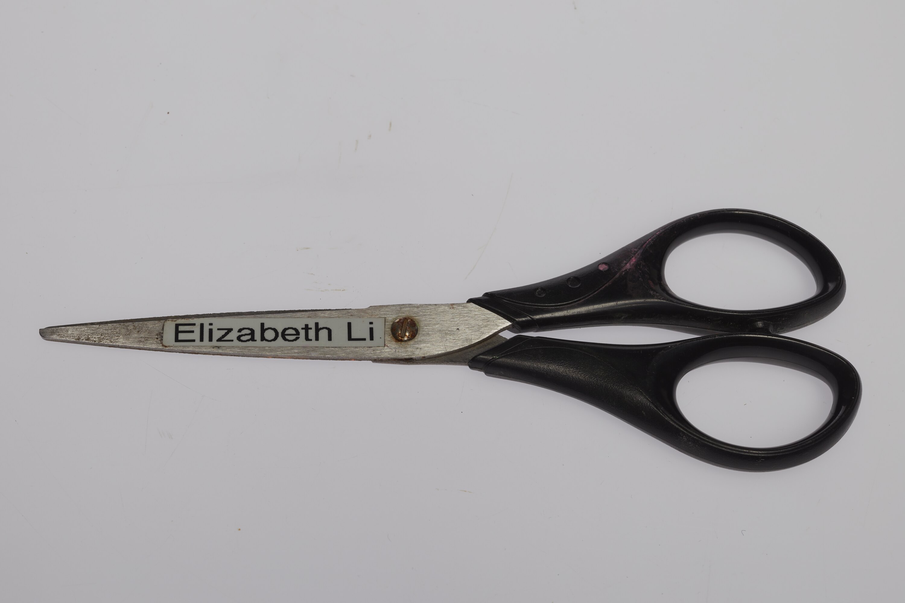 Pair of metal scissors with black plastic handles, identified with paper adhered to one of the blades.