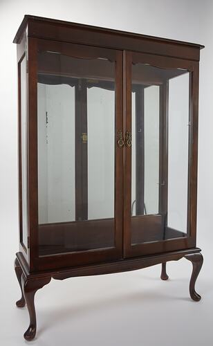 Crystal cabinet used to display the 'Smart' crystal set and the 'Coalport' dinner setting during and after Her Majesty Queen Elizabeth II and HRH The Duke of Edinburgh stayed at O'Shannassy Quarters (Lodge/Chalet/Weir Quarters), 6-8 March 1954, during their Australian tour.