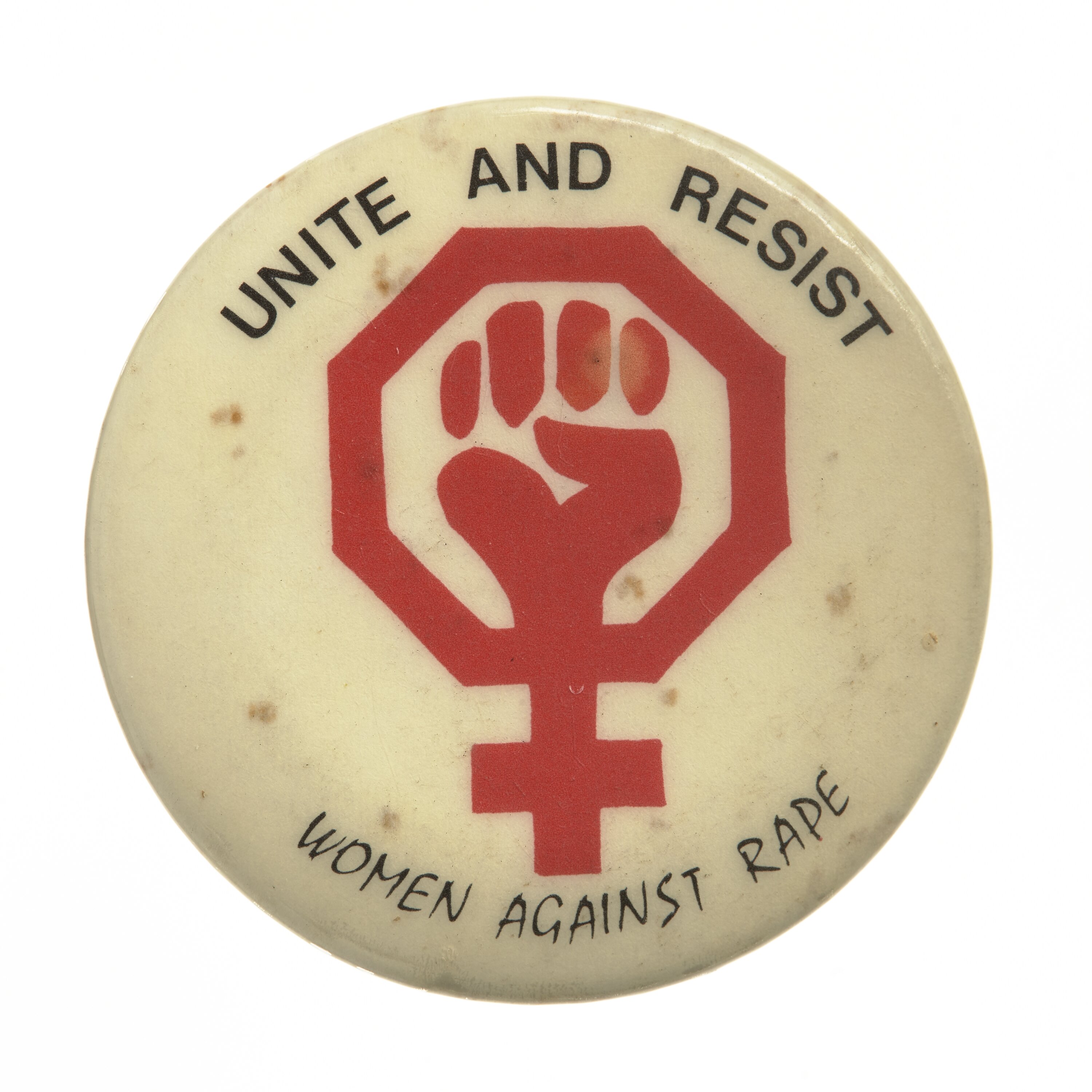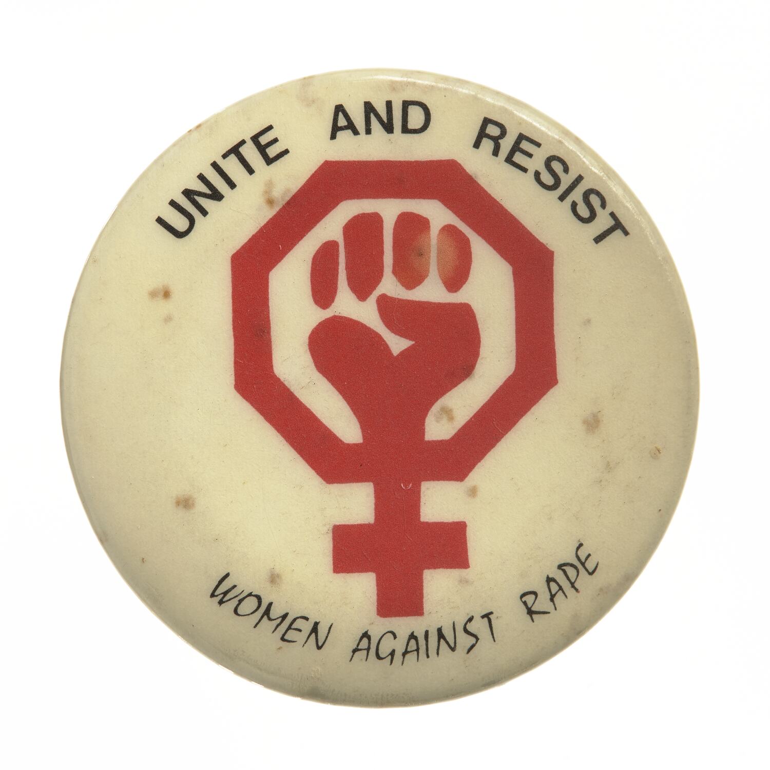 This badge, captioned 'Unite and Resist, Women Against Rape', alternatively known as a button, focuses on the issue of rape.