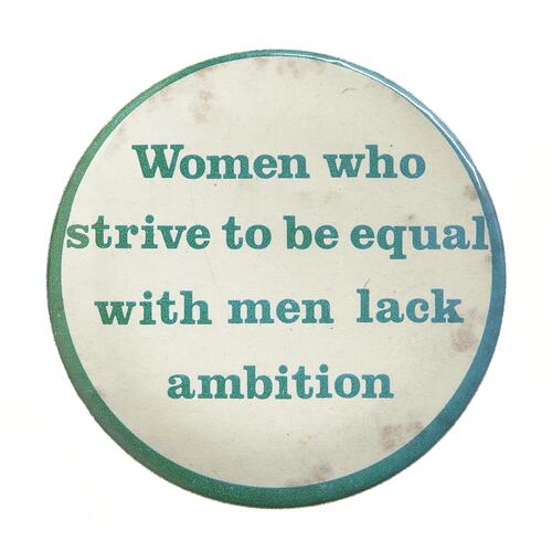Badge, made by Patrick Brothers, with the popular early 1970s Women's Movement slogan 'Women who Strive to be Equal with Men Lack Ambition'.