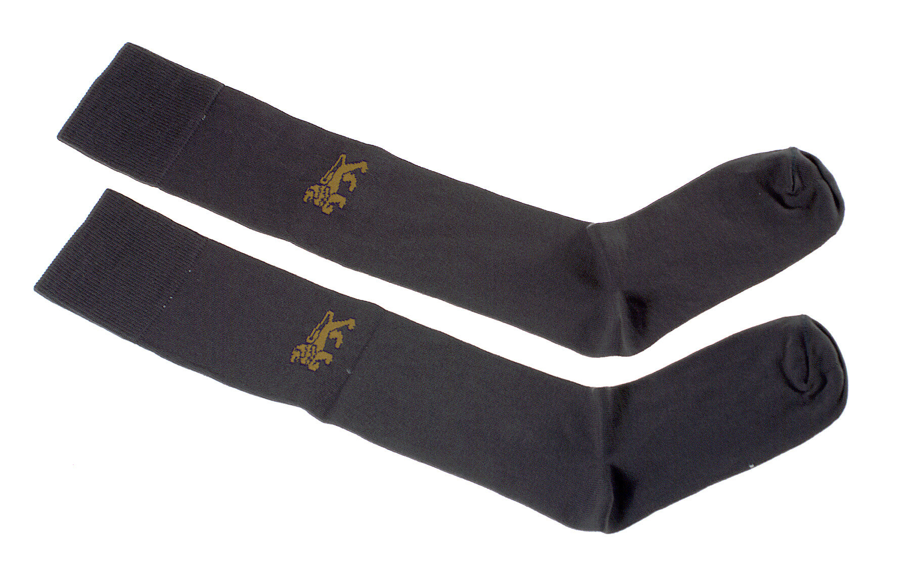 Pair of grey wool-mix socks with gold heraldic lion logo on each side of leg.
