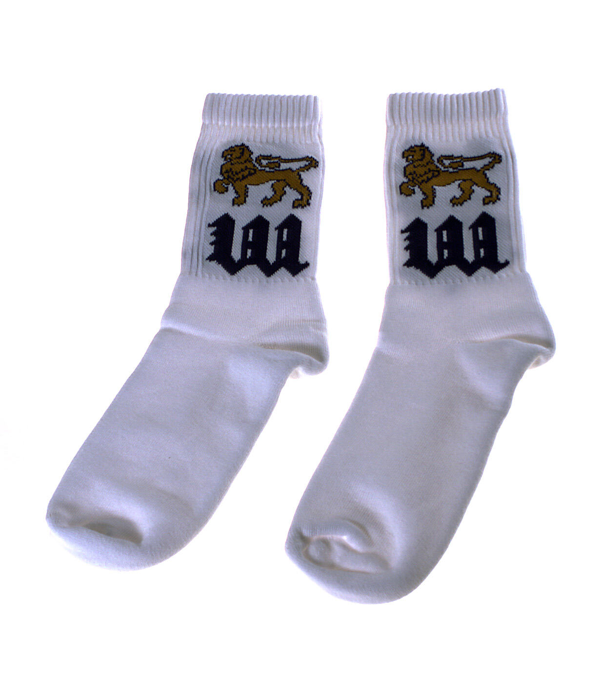 Pair of white cotton sports socks with gold heraldic lion logo and purple "W" on each side (embroidered).
