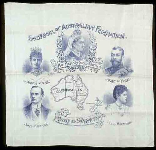 Souvenir handkerchief of Australian Federation, 1901. Features Queen Victoria, the Duke and Duchess of Cornwall & York and Lord and Lady Hopetoun. Lord Hopetoun was the first Governor General of Australia.