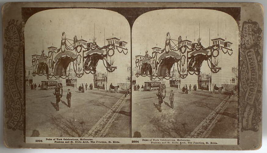 Text: 2994 Duke of York Celebrations, Melbourne./ Prahran and St. Kilda Arch, The Junction, St. Kilda; ROSE'S STEREOSCOPIC VIEWS/ COPYRIGHT; Sold only by/ GEORGE ROSE/ PUBLISHER/ Melbourne.
