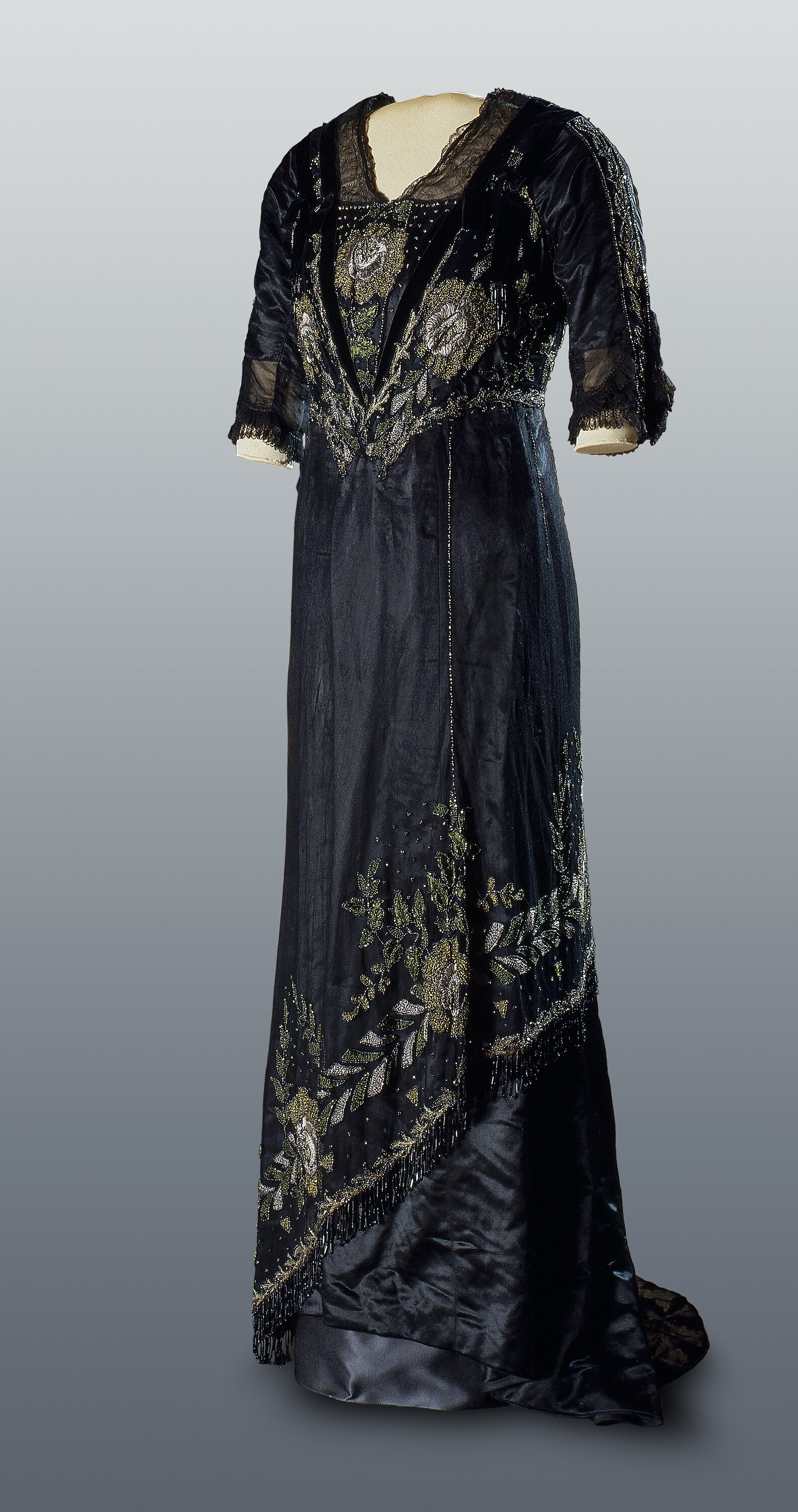 Full length beaded black net and silk satin woman's dress with three-quarter length sleeves, V neckline and centre back opening fastening with metal hooks, and fishtail train. The dress is hand and machine stitched with cotton yarns. It has a base garment of black silk satin which is lined with black wool crepe. A transparent outer garment of black silk net rests over the silk satin. This outer layer is heavily embroidered with green and grey floss silk, gold coloured metal threads in a pattern of leaves and flowers, and metallic looking glass beads. The neckline is trimmed with black silk velvet ribbons.
