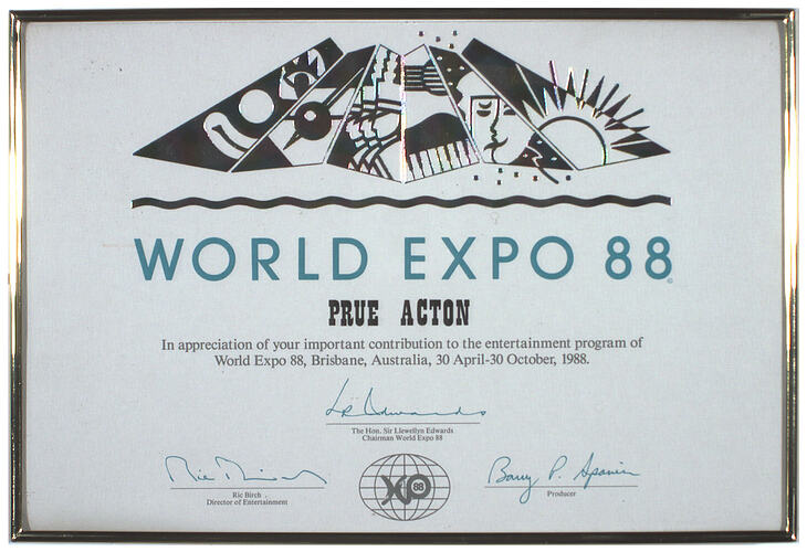 Text printed on front in black, grey and teal: WORLD EXPO 88/ PRUE ACTON/ In appreciation of your important contribution to the entertainment program of/ World Expo 88, Brisbane, Australia, 30 April - 30 October, 1988./