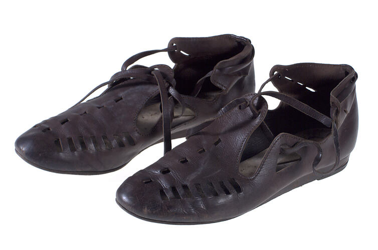 Pair of dark brown openwork leather woman's shoes with solid heels extended to ankles, square holes punched into the front, and extended vamps tied with leather thongs. Used in Melbourne in 1970. Worn by the donor, Prue Acton.