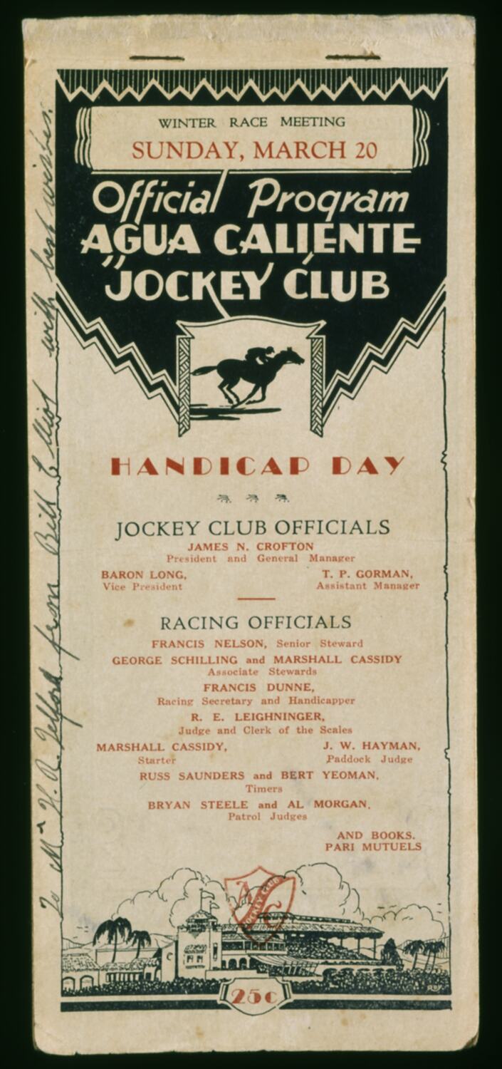 Program consists of multiple long rectangular paper pages bound between two card covers and secured along the top by two metal staples. Printed on the cover is a silhouette of a horse and jockey racing, while along the bottom is a drawing of the grandstand at Agua Caliente racetrack. These images are surrounded by navy blue and red print. There is also an inscription handwritten in black ink down the left side. Inside are details of the various races as well as advertising dotted throughout. There are also some handwritten notes on the page that detail the thirteenth race. On the back cover is some printed information detailing the introduction of the Daily Double.