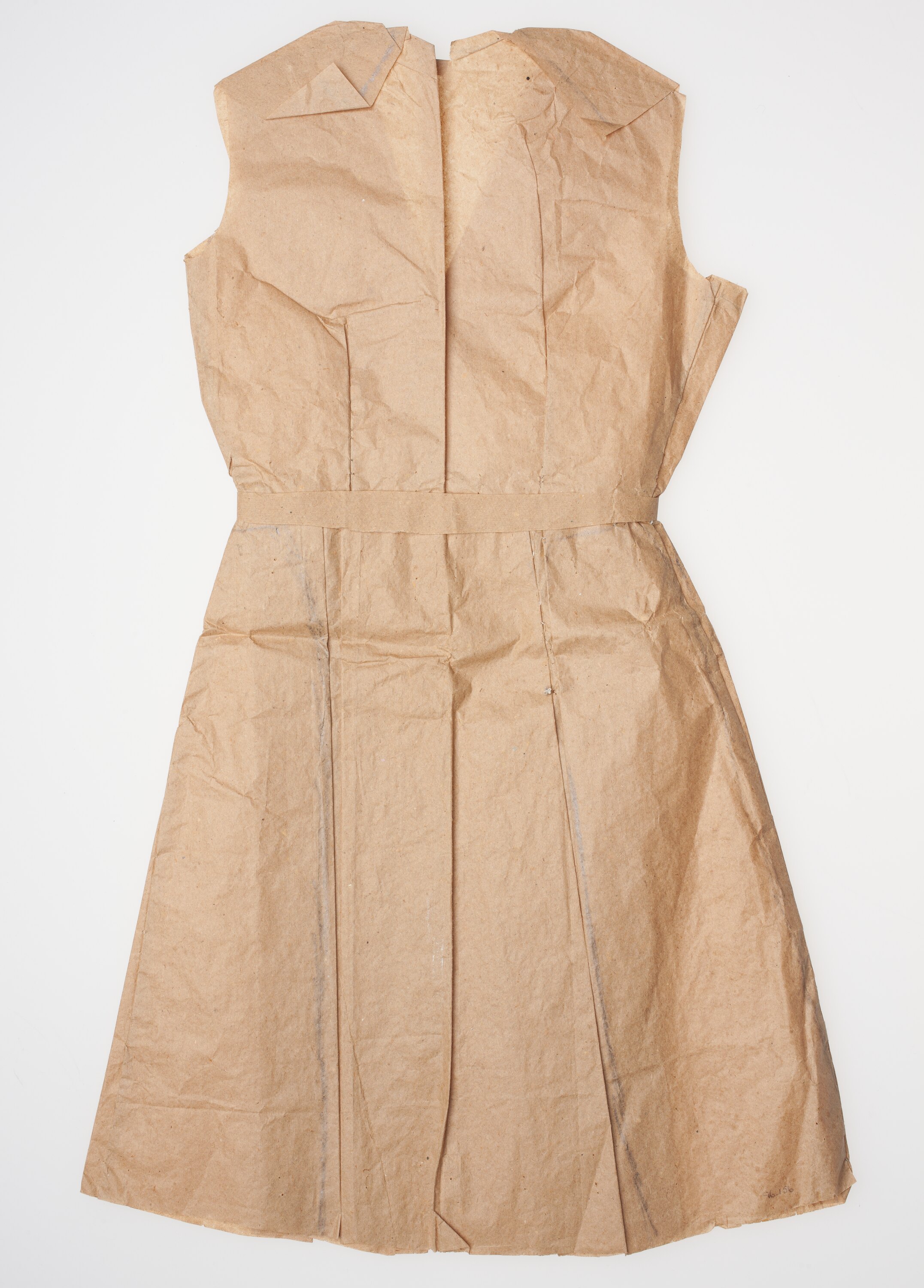 The pattern is of brown paper and is for a full-length coat-type dress with a shawl collar and matching belt. It is belted, sleeve less and has two pleats, front and back. There are five simulated silver paper front buttons.