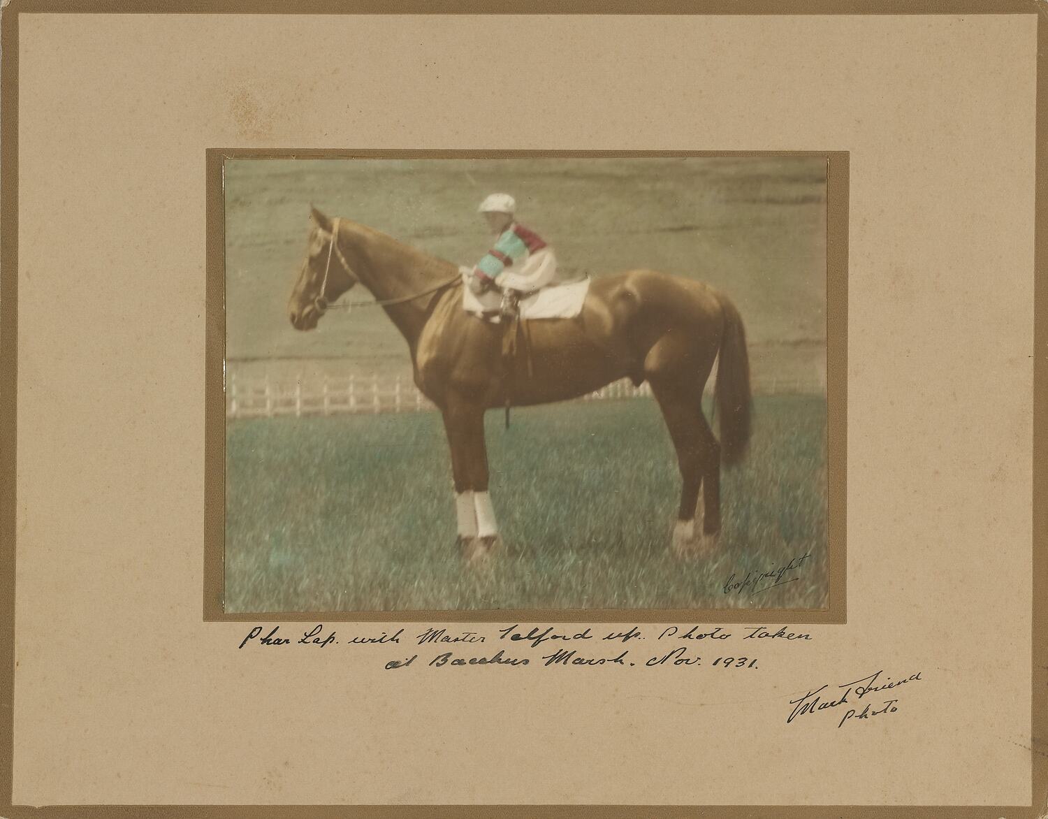 Mounted hand tinted sepia photograph depicting Gerald Telford, son of trainer Harry Telford, sitting on the back of Phar Lap, on a property at Bacchus Marsh. It was taken just prior to Phar Lap's trip to North America in November, 1931.