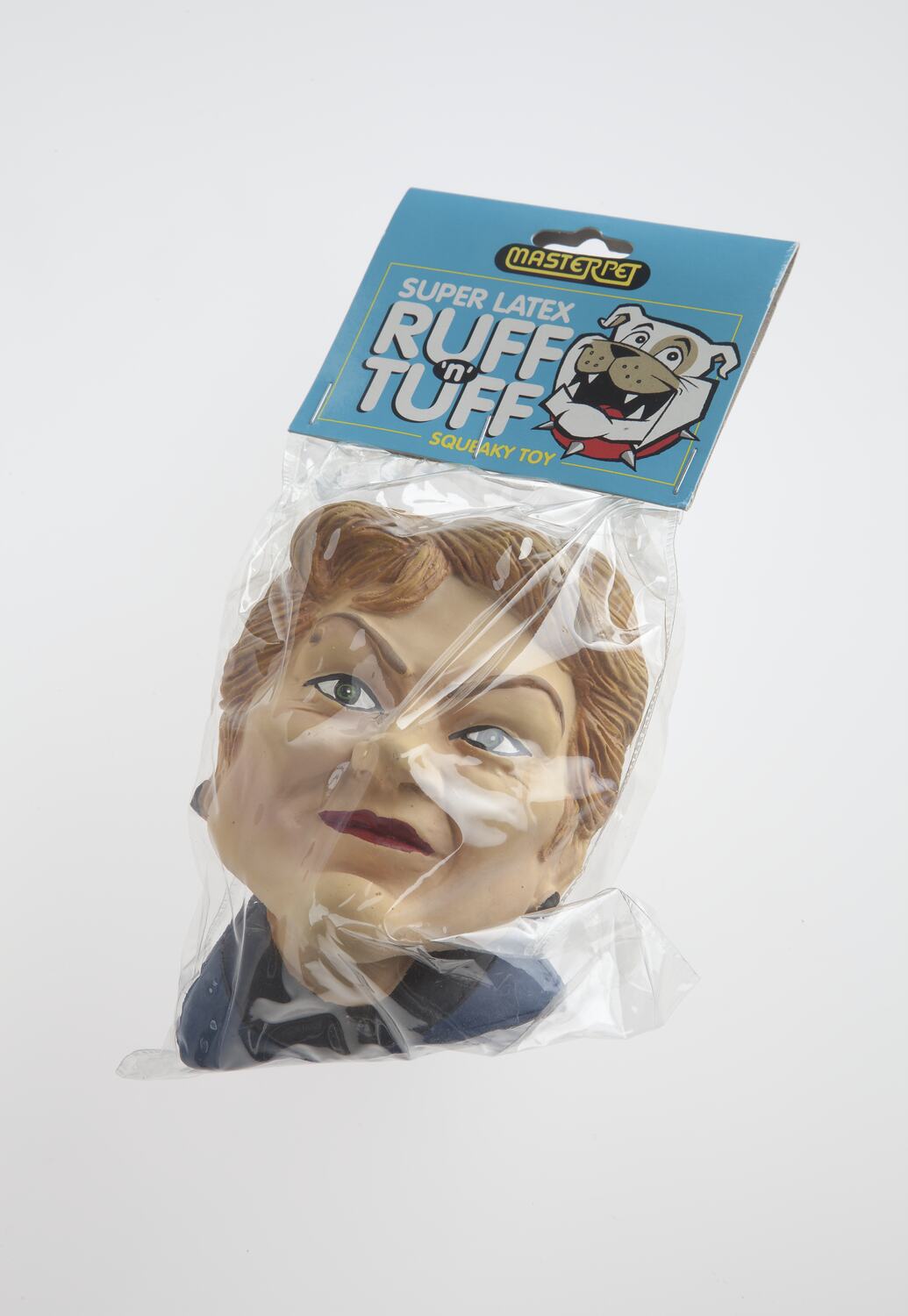 Super Latex Ruff 'n' Tuff rubber squeaky toy for dogs, made by Masterpet circa 1997. The toy features a caricature of former One Nation Party leader Pauline Hanson's head. This object graphically illustrates how Hanson polarised the community and the extremity of emotional responses to her as a person and policy maker. This particular rendition of Hanson is particularly vicious but was extremely popular - suppliers consistently sold out of them. Then as the politician's star fell, production ceased.