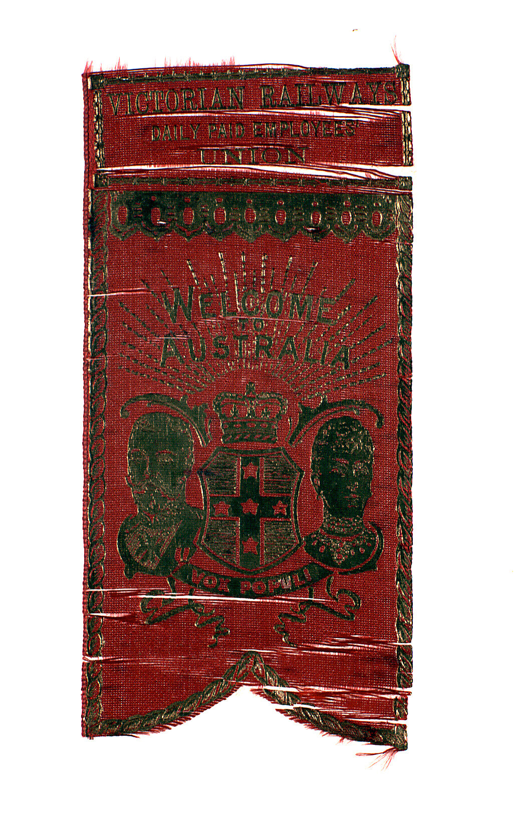 Embroidered in gold: VICTORIAN RAILWAYS / DAILY PAID EMPLOYEES/ UNION / WELCOME / TO / AUSTRALIA / VOX POPULI