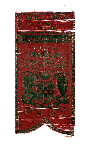 This red silk ribbon was produced by the Victorian Railways Daily Paid Employees Union to commemorate the visit to Victoria of the Duke and Duchess of Cornwall and York in 1901. The image includes a crown, a shield with five stars, the heads of the Duke and Duchess, and text. It was manufactured in 1901.