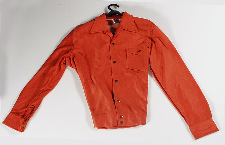 First manufactured in 1959 this shirt featured either a jacket styling or a sports styling with a V-front. It was made from a non-directional suede treated with a new fabric process, Terlinden. The shirt retailed for £79/11 and was stocked by Myer.