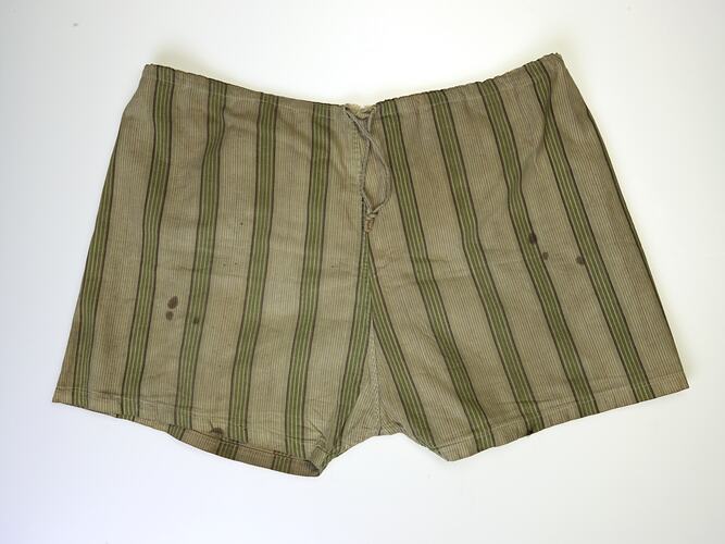Pair of green striped cotton draw-string shorts worn by Huu Minh when he escaped from Vietnam in 1978. Huu wore these shorts to disguise himself as a fisherman during the escape. Huu and his wife escaped from Vietnam on the 19th May 1978. They spend time in a refugee camp in Malaysia before obtaining refugee visas for Australia.