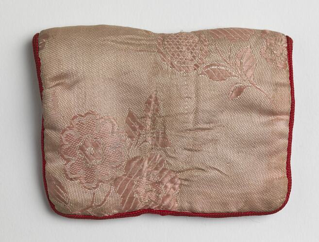 Pink silk pouch used by Cuc Lam when she escaped from Vietnam in May 1978. Cuc used this pouch to keep the few personal mementos she brought with her safe during the boat ride from Vietnam to Malaysia. In it she stored a negative of her family photo, passport photos of her mother, a watch and her wedding ring. After their escape from Vietnam Cuc and her husband spent time in a refugee camp in Malaysia before gaining a visa for Australia.