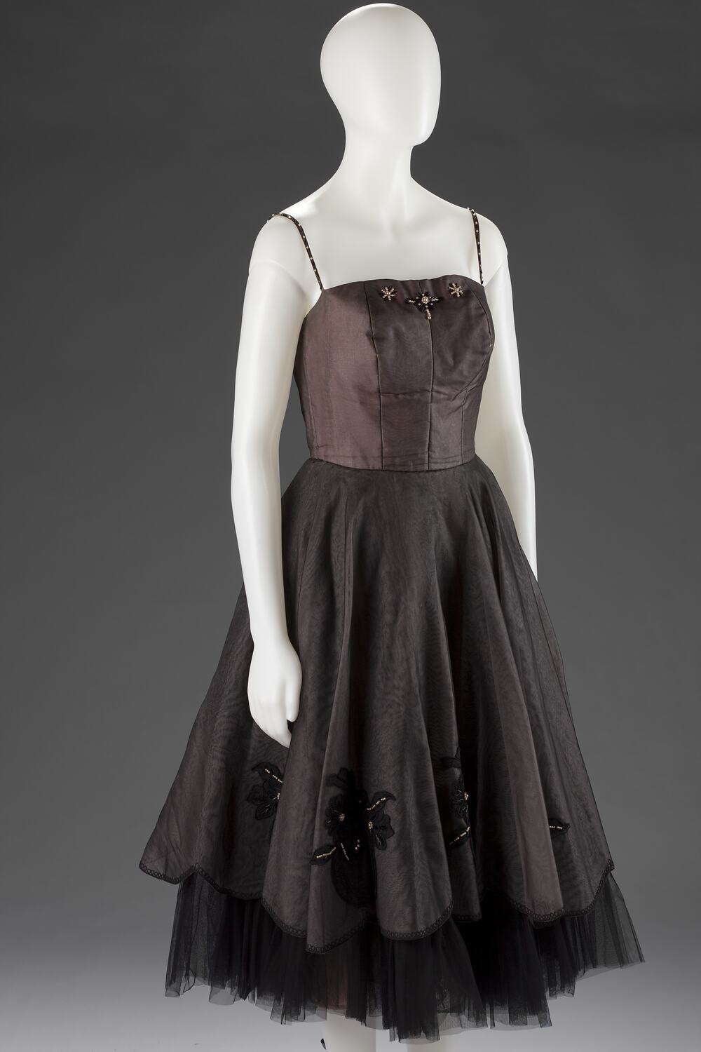 Dress with fitted brown bodice with shoestring straps. There is gold beaded detailing along the top of the bodice and on the straps. The dress has a full skirt which falls to mid calf. The skirt is composed of four layers of dark brown tulle over a light brown lining. The lining and first layer of tulle are mid-calf length, then each subsequent layer of tulle is shorter. Over the tulle is a layer of dark brown sheer chiffon which is knee length at the front of the skirt, then shortens around the back exposing the layers of tulle underneath. The chiffon has embroidered and beaded dark brown flowers along the bottom.