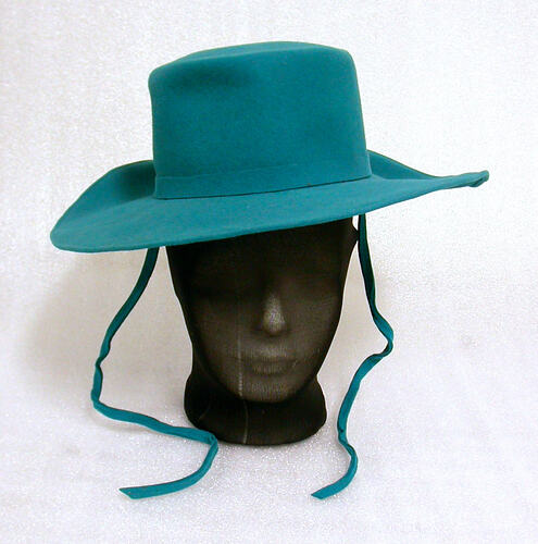Hat of teal felt - sailor or fedora shape, with flat top. Made in New Zealand by 'James'; hood is stamped 'Moreton, France'.
