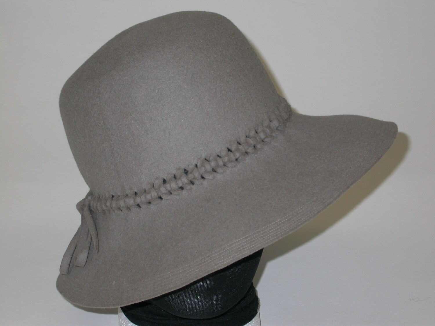 Grey felt, fedora shape. Blocked velour hood. Stitched edge. Intricate interlacing around edge of crown. Felt bow on side.