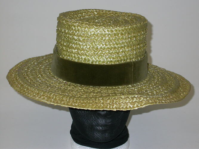 Gold sailor shape hat. Blocked Swiss braid hood with a wired brim and green velour trim. Made by Jean Rooks, Eaglemont.