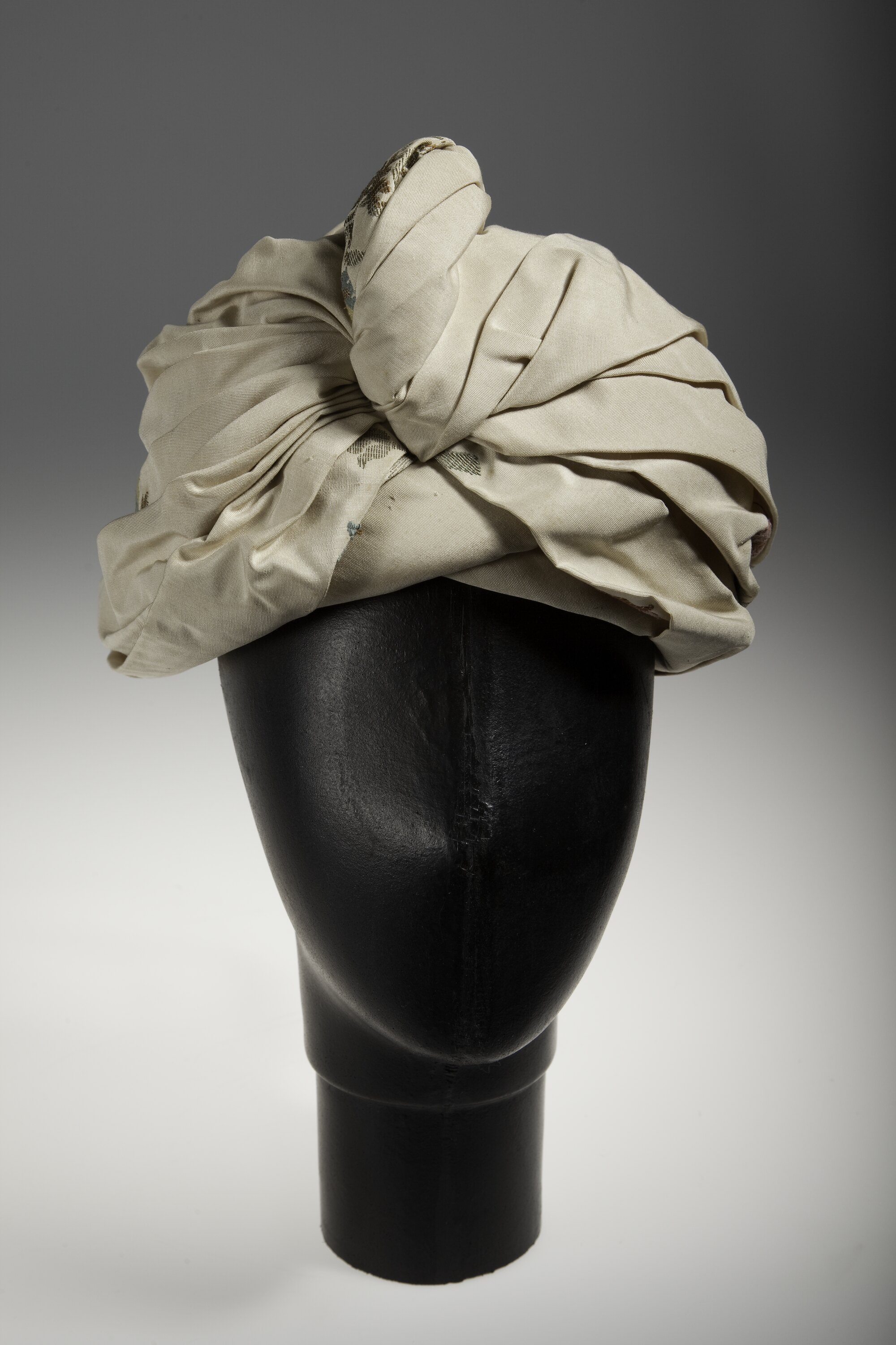 Turban, sparterie shape, draped with shantung fabric. Made by Jean Rooks, Eaglemont.