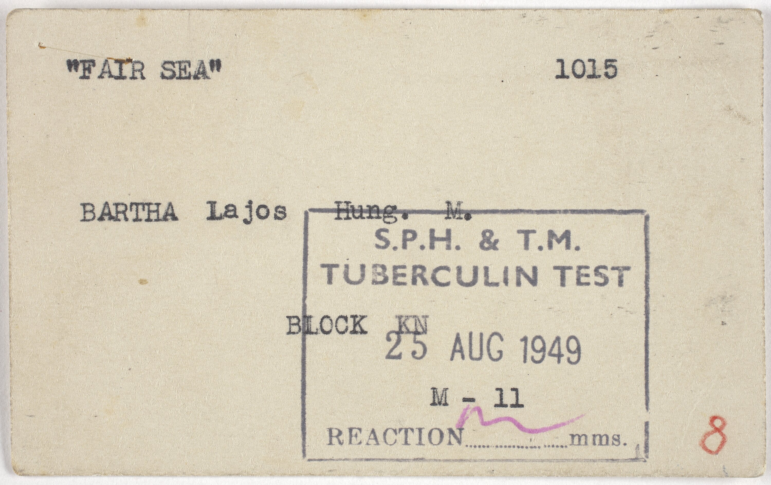 Text: FAIR SEA 1015/BARTHA Lajos Hung. M./S.P.H. & T.M./TUBERCULIN TEST/BLOCK KN/25 AUG 1949/M-11/REACTION mms.