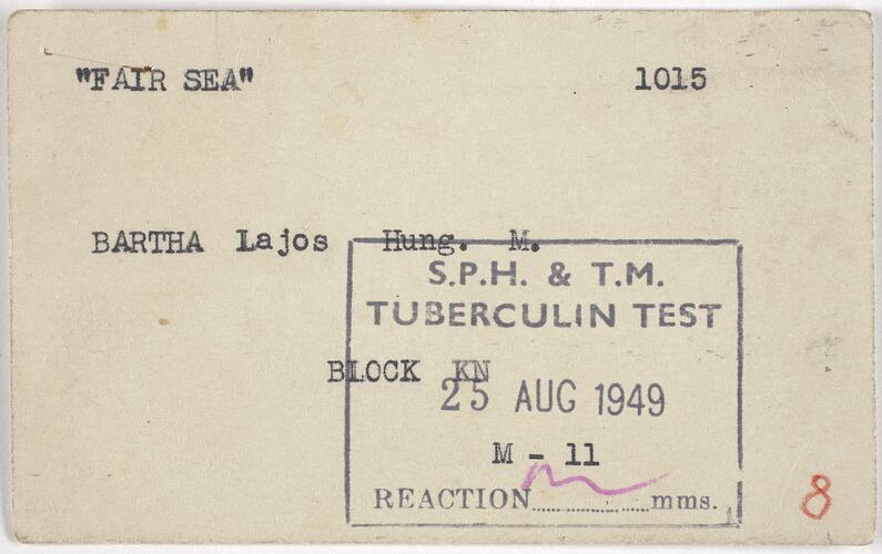 Card for a Tuberculosis Test issued to Lou (Lajos) Bartha when he immigrated to Australia from Hungary on the MV Fairsea in 1949.
