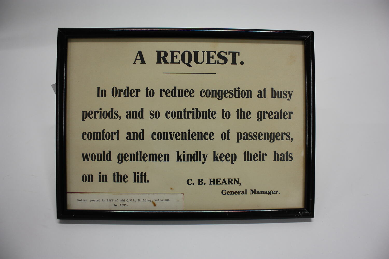 Printed text: A REQUEST/In Order to reduce congestion at busy/ periods, and so contribute to the greater/comfort and convenience of passengers, /would gentlemen kindly keep their hats/on in the lift./C.B. HEARN/General Manager.