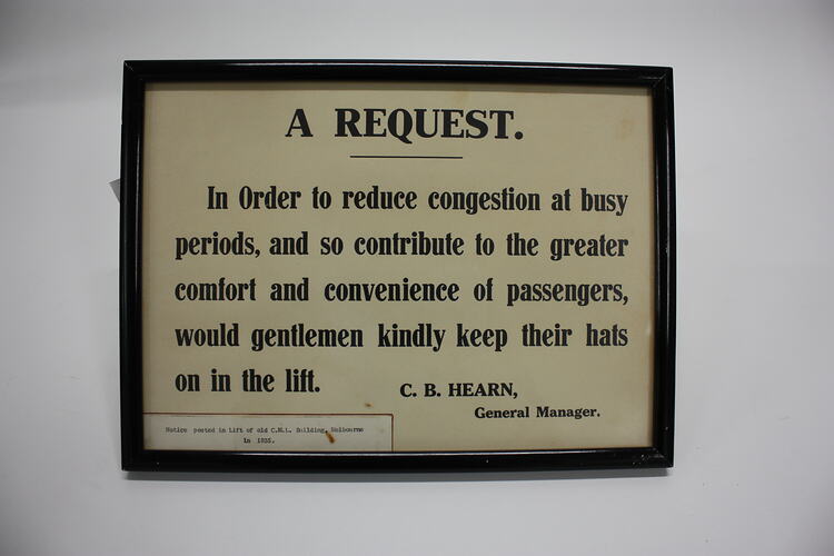 Framed notice that once hung in a lift of the Colonial Mutual Life building on the corner of Collins and Elizabeth Streets. It dates from the 1930s when workers worked very defined hours, arrived at essentially the same time, took the same lunch hours, and finished work at the same time. Male office workers would wear hats to work, and this sign requests them to keep them on their heads in the lift, in order to allow more room so that more people could ride in the lift at busy times.