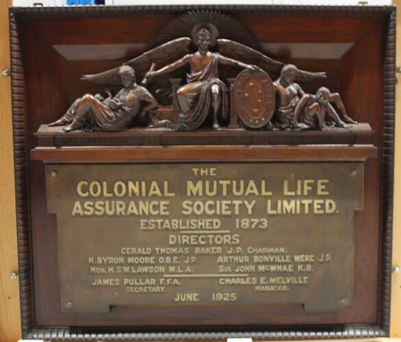 Plaque for the Colonial Mutual Life (CML) Assurance Society Limited used from about 1935 until the demolition of the CML Building in 1960. The plaque was transferred to the Museum by the Commonwealth Bank (who purchased CML) when the Bank's Archives were being moved to Sydney.