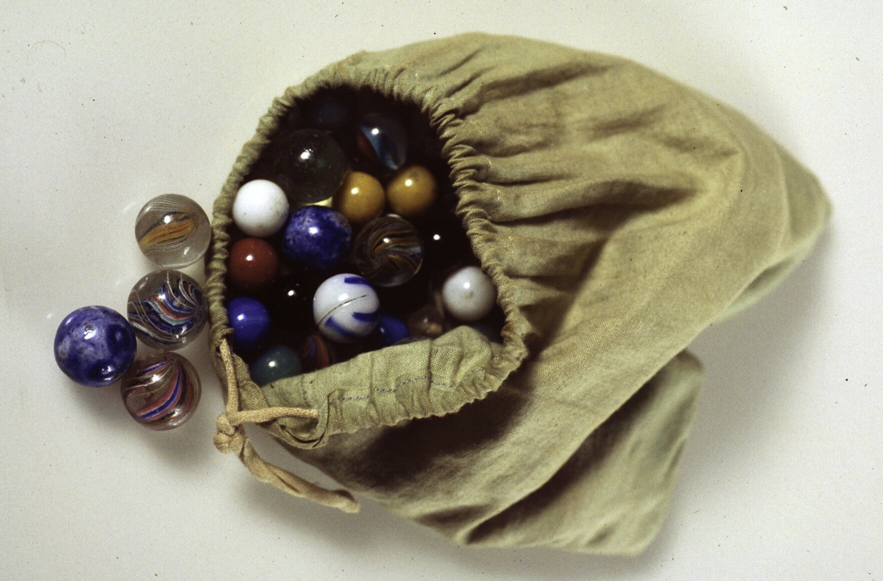 Assorted marbles, perhaps of different dates. Housed in a green cloth bag.