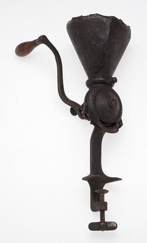 Metal coffee mill, manufactured by Landers, Frary and Clark, New Britain, Connecticut, USA, circa 1905. It was brought to Australia by Vincenzo Candela and his wife Emanuela Nigro, when they migrated in 1920. The Candelas made much of their own food including homemade pasta, tomato sauce, wine, sausages and they roasted their own coffee. Items that could not be purchased in Australia were often ordered by mail from the Italian manufacturer. This was a practice common in both Italy and Australia. Vincenzo also received catalogues from Italy after his migration to Australia.