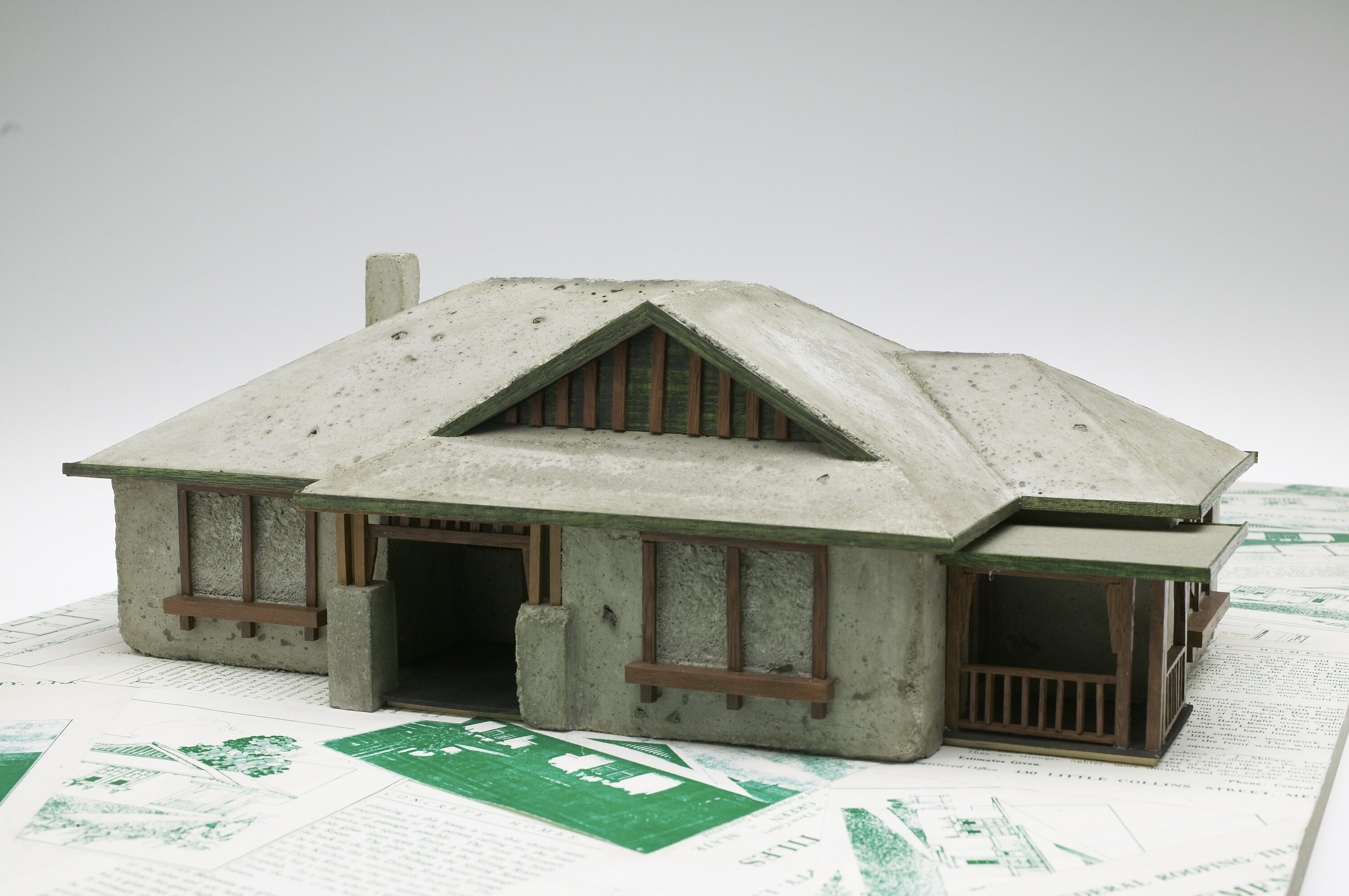 Model of a concrete house built for J. Milligan, Esq., Mulgoa Grove, Brighton, Victoria. The house was designed by the architect Leslie M. Perrott Snr, and built in 1922. Perrott has been described as a 'dominant architect' in the inter-war period, when he was designing major hotels in Melbourne. He established his business in 1914, focussing on concrete construction.