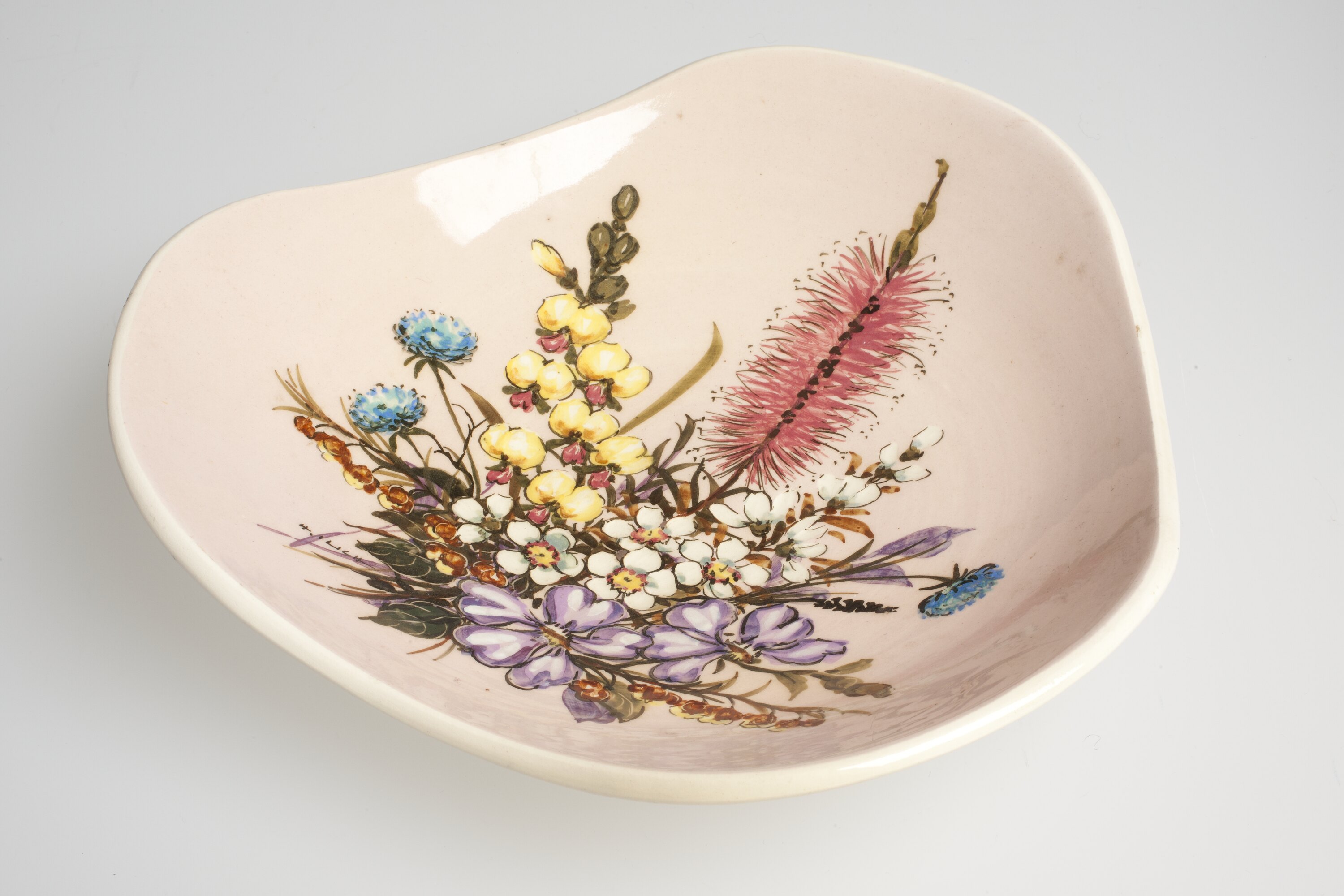 Ceramic dish with a floral design on a light pink background. The central floral design has a variety of flowers in blue, purple, red, yellow and white and green foliage.