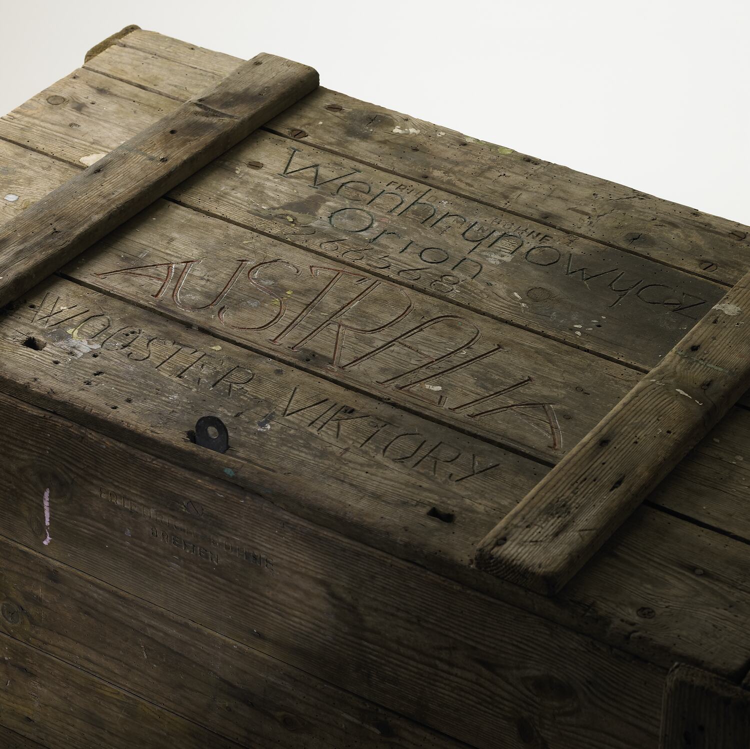 Wooden trunk, which was previously an ammunition chest, made circa 1939 - 1945. It was salvaged by Ukrainian refugee Orion Wenhrynowycz, from many littering the countryside whilst he was in a German transit camp waiting to come to Australia. Orion used this discarded munitions crate to transport his few possessions from a displaced person's camp in Germany to Australia, when he migrated in 1948.