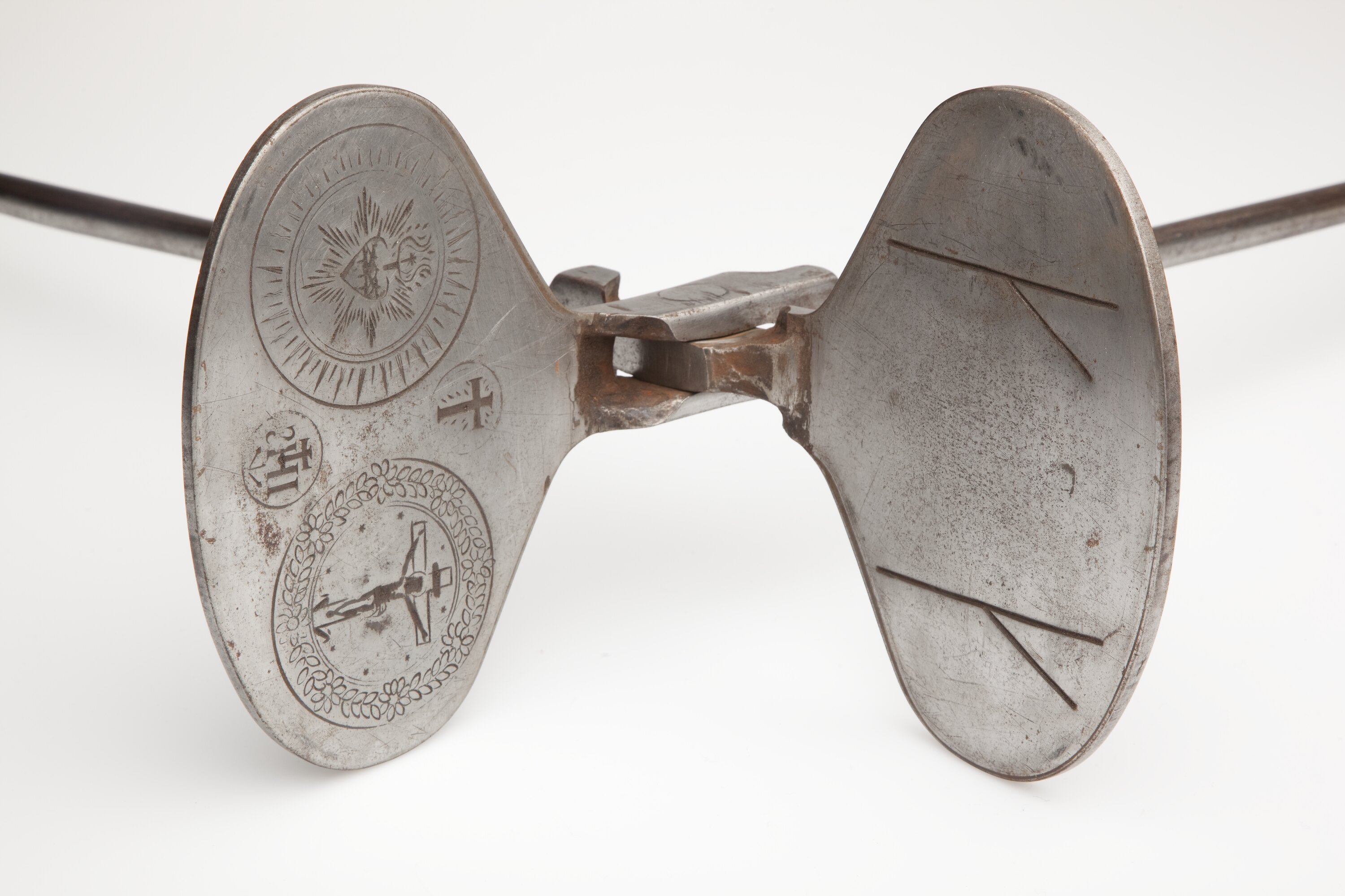 Metal Wafer Iron with long handles. The iron section is oval in shape. There is a metal clasp at the end of the handle to help press the iron flat. On the inside of the iron, patterns have been impressed into the metal. One plate has two Y shaped markings. The other plate has a cross within a circle at the top, and the IHS symbol (a monogram which represents the Holy Name of Jesus, the letters IHS within a circle with a cross), at the bottom. On the left hand side of this plate is a picture of Christ on the cross, within a wreath of flowers on one side; and a sacred heart, (flaming heart shining with divine light, pierced by the lance-wound, surrounded by a crown of thorns, surmounted by a cross and bleeding) on the right hand side.